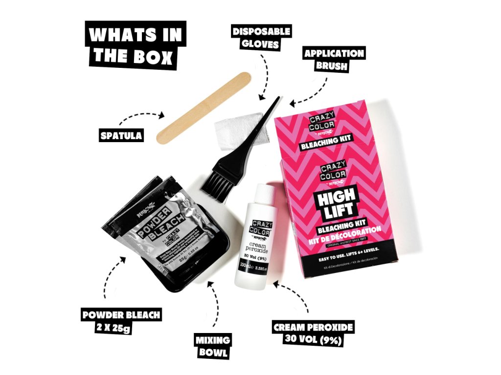 Súprava na bielenie vlasov Crazy color. Vhodné na použitie pred nanesením Crazy Color. Súprava obsahuje všetko, čo potrebujete na zosvetlenie.