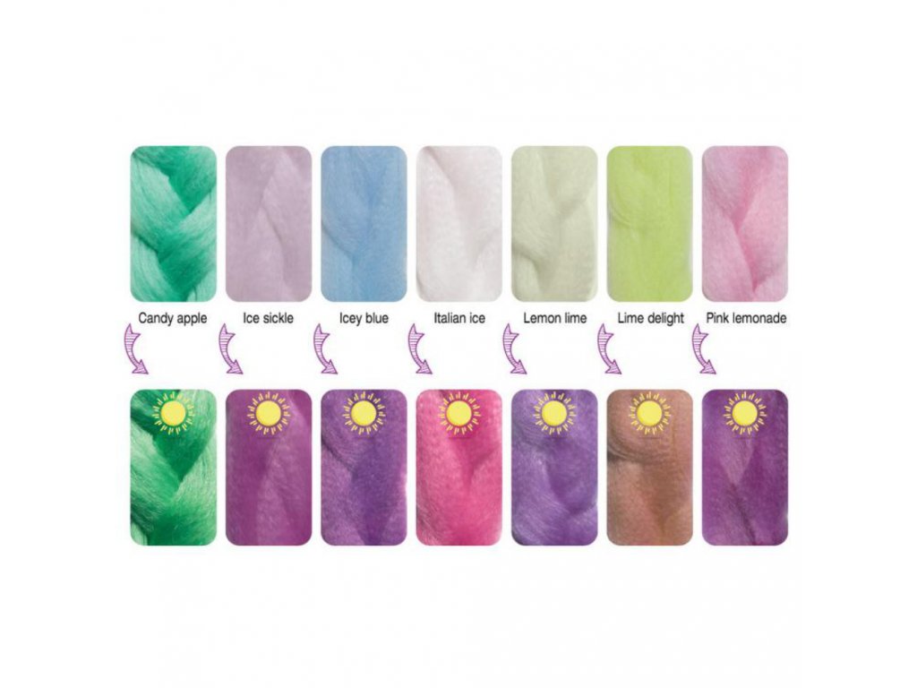 Kanekalon reaguje na slnko zmenou farby zo svtlo rúžovej na fialovú.